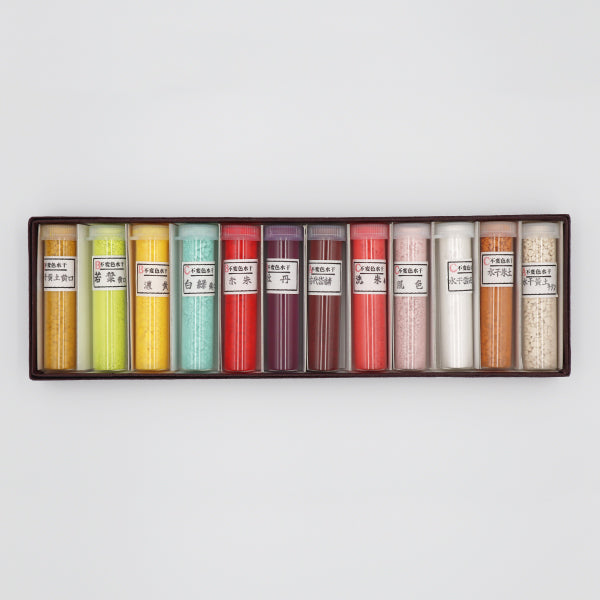 水干絵具は純良優秀な退色しにくい顔料および鉱物質を原料としております。上羽絵惣の水干絵具は粒子が極めて細かいため、のびが良く混色自由にあらゆる色調を表現して頂けますため岩絵具普及前から多くの方々に御愛用頂いております。