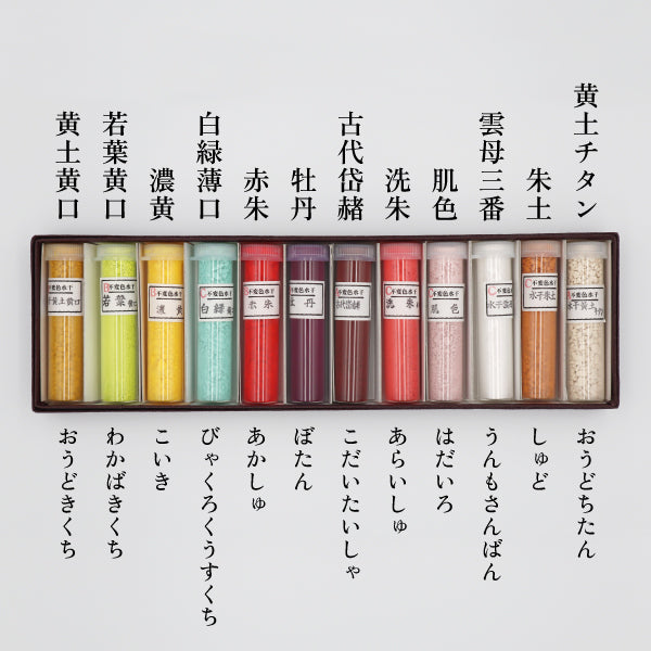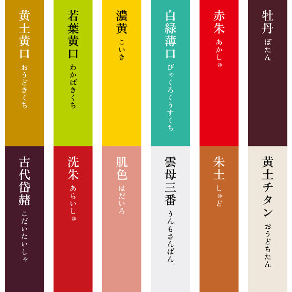 黄土黄口/若葉黄口/濃黄/白緑薄口/赤朱/牡丹/古代岱赭/洗朱/肌色/雲母三番/朱土/黄土チタン