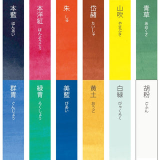 本藍/本洋紅/朱/岱赭/山吹/青草/群青/緑青/美藍/黄土/白緑/胡粉