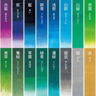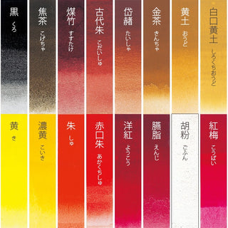 黒/焦茶/煤竹/古代朱/岱赭/金茶/黄土/白口黄土/黄/濃黄/朱/赤口朱/洋紅/臙脂/胡粉(2本)/紅梅/赤紫/紫/藍/群青/浅葱/白群/白緑/若葉/黄草/鶯緑/青葉/緑青/濃緑/銀鼠/銀/金