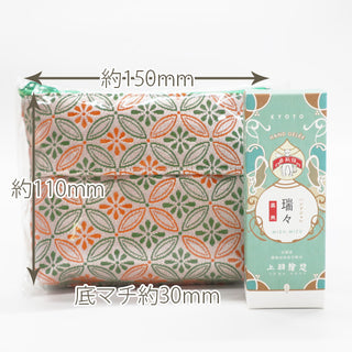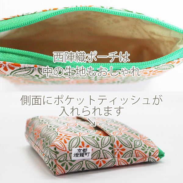 西陣織元「もりさん」の西陣織生地で作ったポーチ。ファスナーで開閉する本体部分と、側面にはポケットがついています。かわいい花七宝柄は4種類の色使いから選べます。